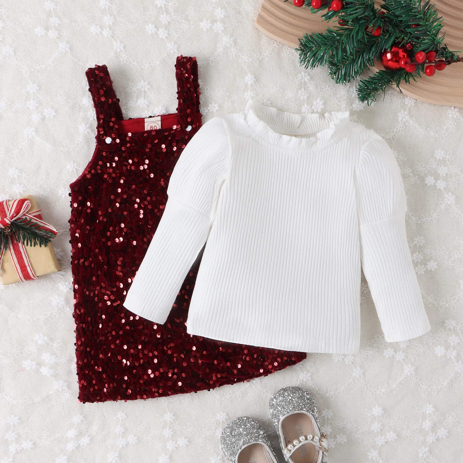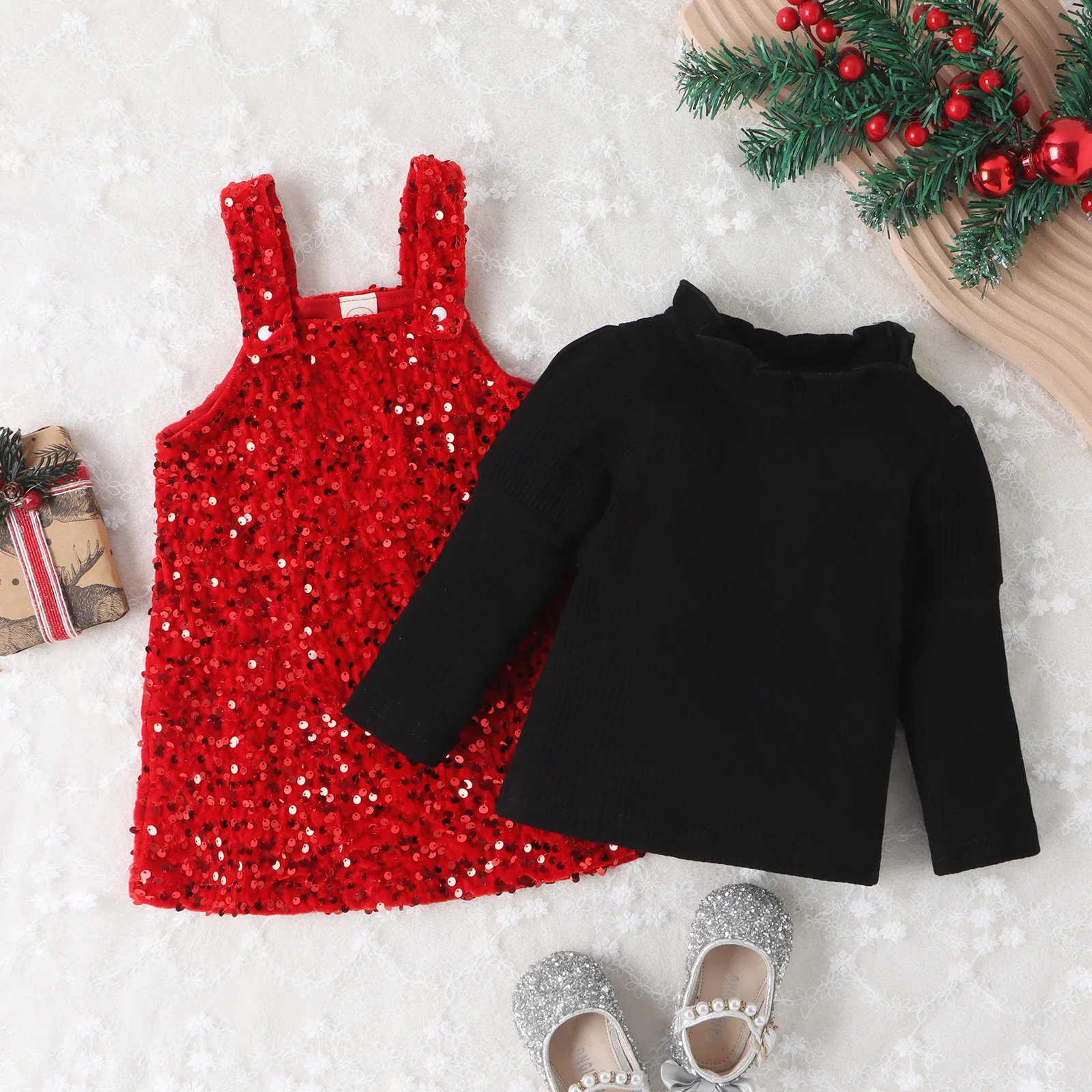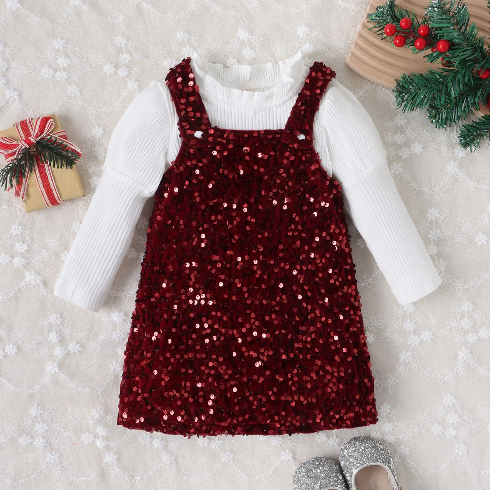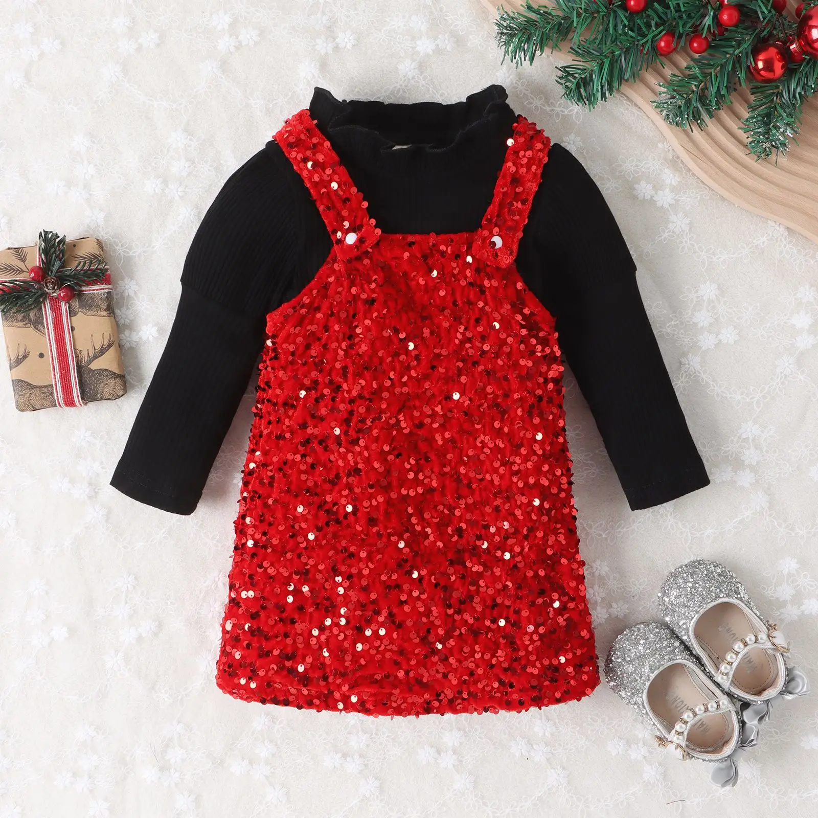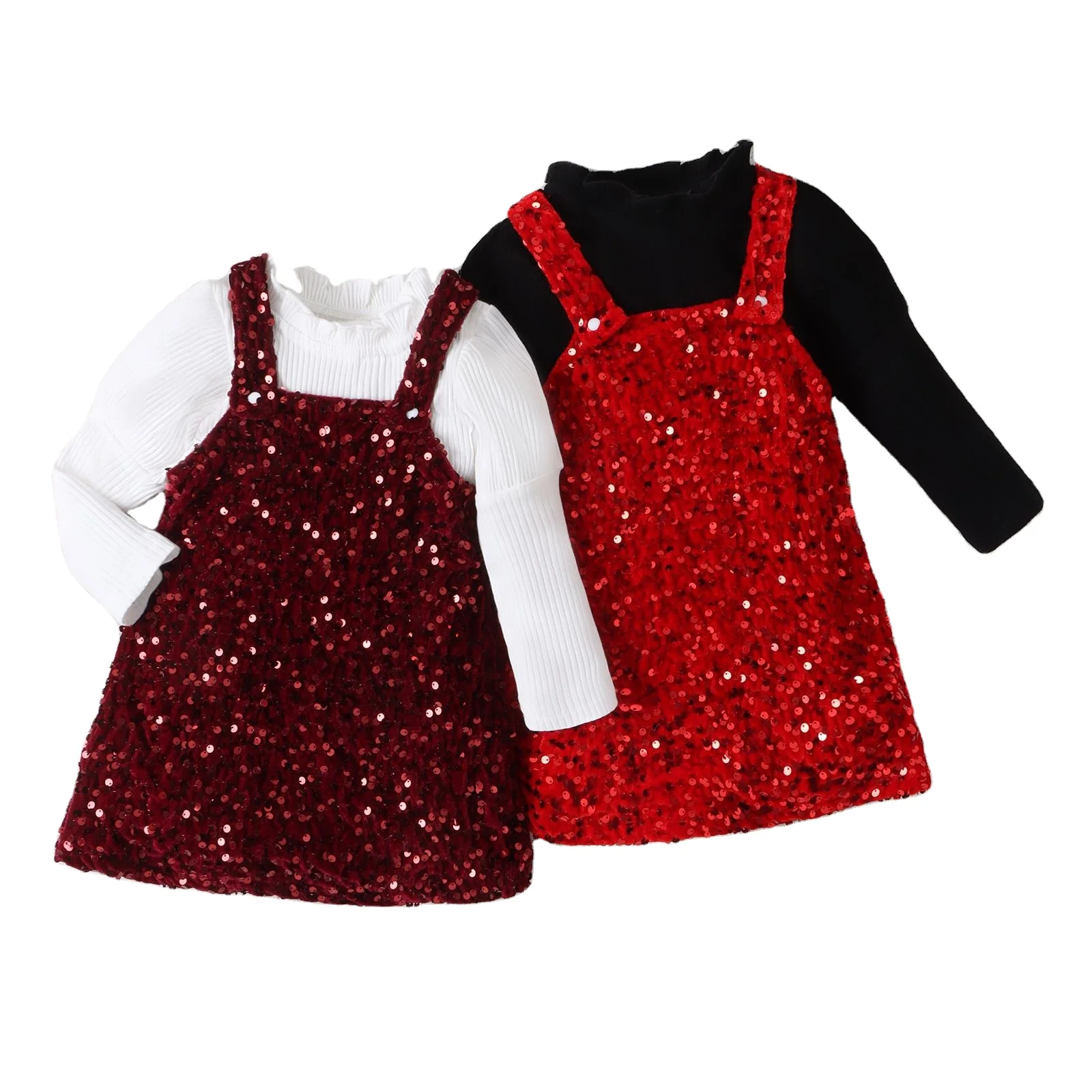 2023 New Design Toddler Kids Autumn Casual Clothes Sets Ribbed Three Quarter Sleeve Tops Sequins Suspender Dress 2pcs Girls